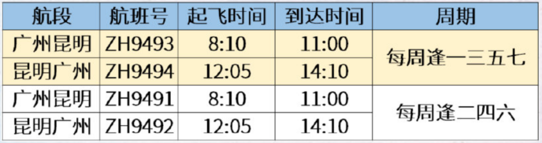 昆明航空:恢复昆明=襄阳,航班号KY8275/6,班期每天一班,机型为波音737-800,昆明起飞20:05,22:00到达襄阳,襄阳起飞22:45,01:00+1返回昆明。(来源:民航资源网)
