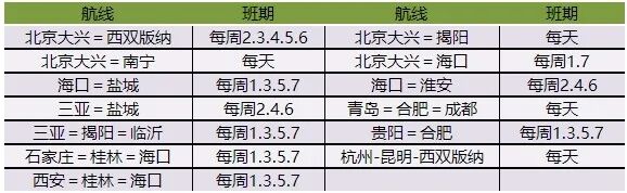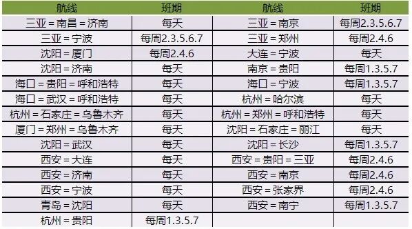 新开杭州=盐城=西宁、杭州=铜仁=昆明、杭州=临沂=银川、杭州=铜仁=丽江、杭州=延安=兰州、杭州=遵义=西双版纳、杭州=泉州=三亚、杭州=邯郸=西宁、杭州=鄂尔多斯、宁波=毕节=丽江、宁波=襄阳=丽江、宁波=南阳=西宁、温州=深圳、温州=徐州=西宁、温州=十堰=丽江、温州=桂林=西双版纳、温州=武汉、温州=遵义=丽江、温州=临沂=西宁、西安=成都、西安=沈阳、西安=长沙、西安=银川等航线。(来源:民航资源网)