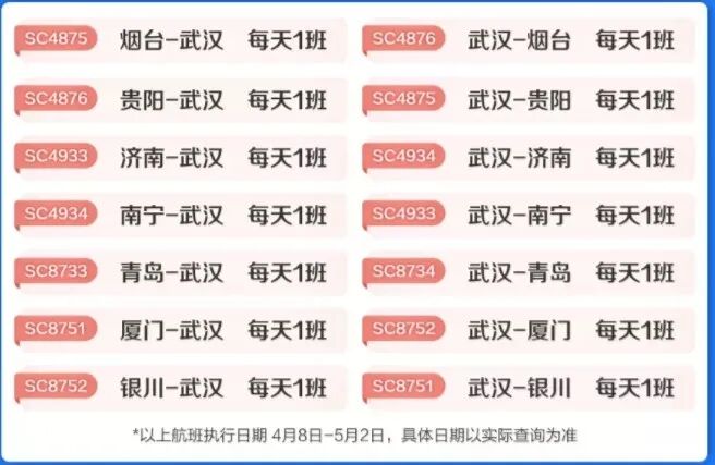 4月8日起,武汉=泉州,沈阳=武汉=南宁,泉州=武汉=兰州,深圳=武汉=呼和浩特恢复(来源:深圳航空官方微博)