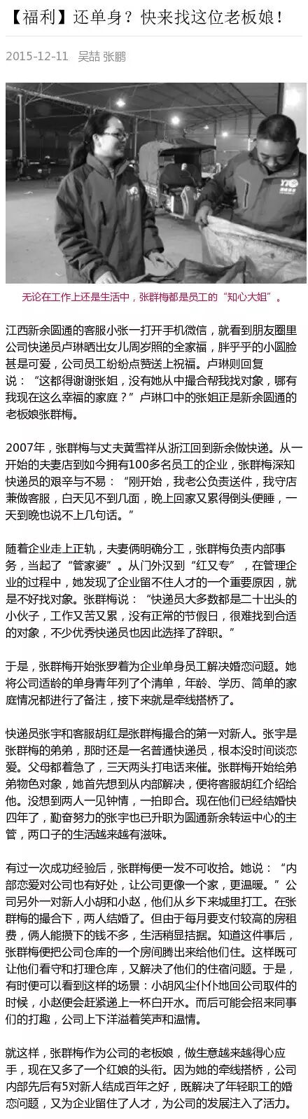 江西新余圆通的客服小张一打开手机微信,就看到朋友圈里公司快递员卢琳晒出女儿周岁照的全家福,胖乎乎的小圆脸甚是可爱,公司员工纷纷点赞。卢琳回复说:“这都得谢谢张姐,没有她帮我找对象,哪有我现在这么幸福的家?”卢琳口中的张姐正是新余圆通老板娘张群梅。