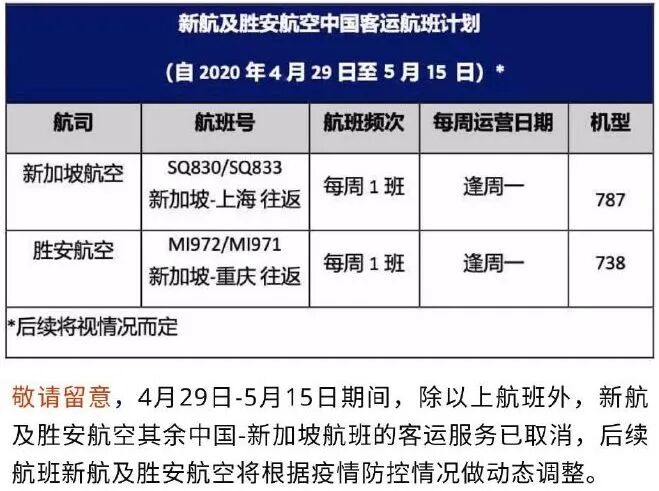 新加坡航空及胜安航空:4月29日-5月15日新加坡航空及胜安航空航班调整,新加坡航空为每周一上海往返新加坡;胜安航空保留每周一重庆往返新加坡。