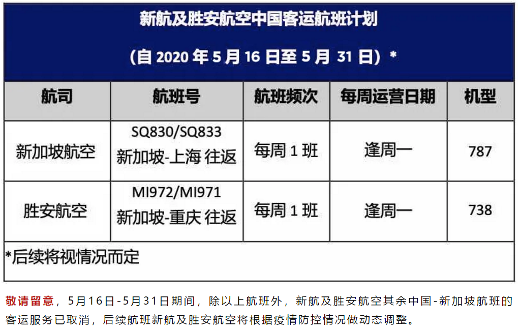 5月16日-5月31日期间,新加坡航空将保留每周一上海往返新加坡的一个航班,胜安航空将保留每周一重庆往返新加坡的一个航班。