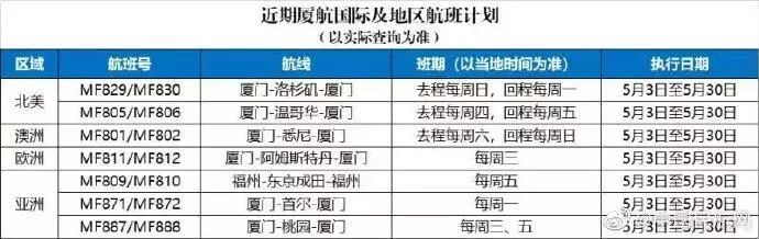 厦门航空:5月国际航班计划(来源:中国民航网)