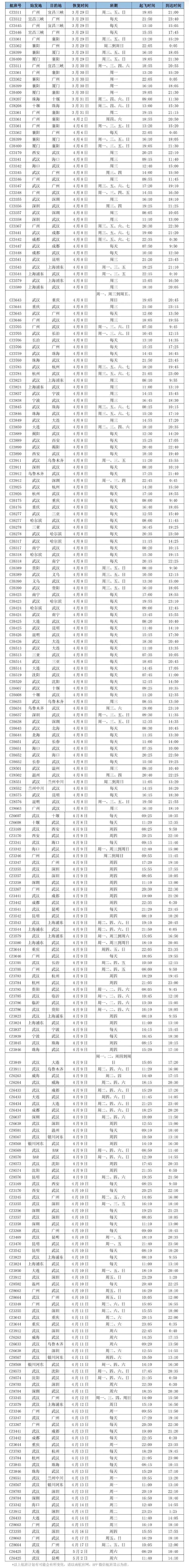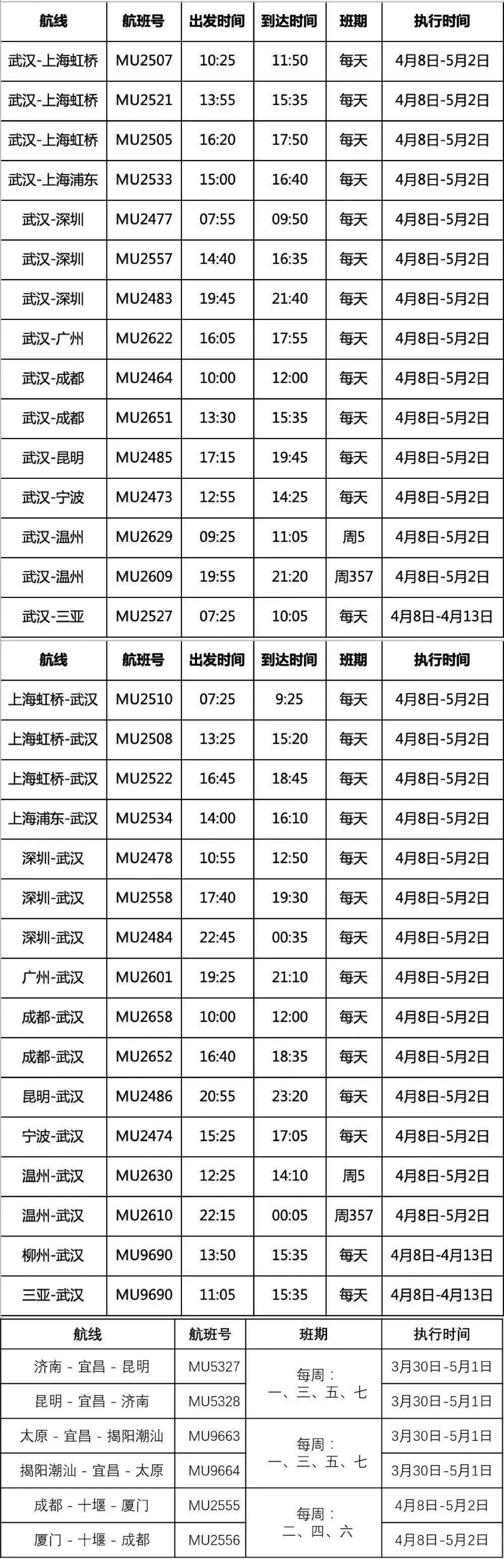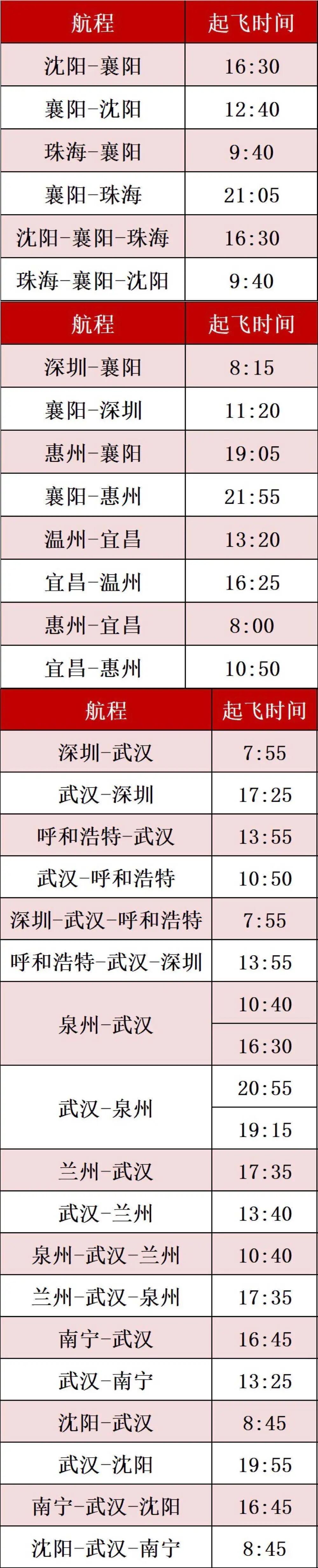 3月29日-5月2日,上海浦东=襄阳,每周一至两班;