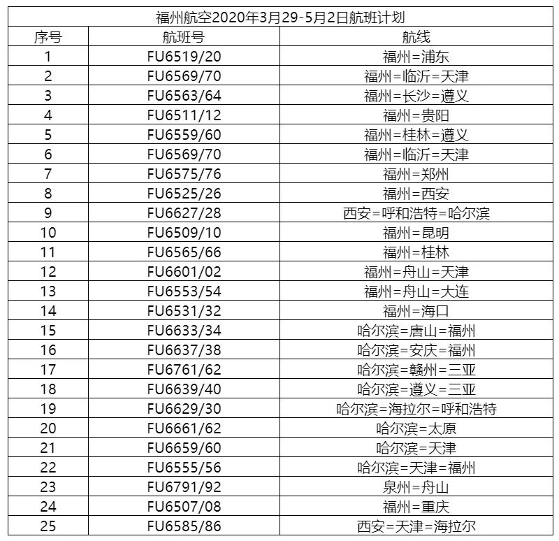 公布3月29日-5月2日航班计划,具体如下(航班信息仅供参考,请以实际执行为准)