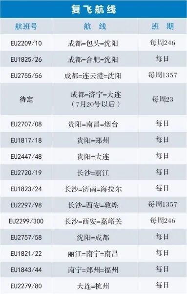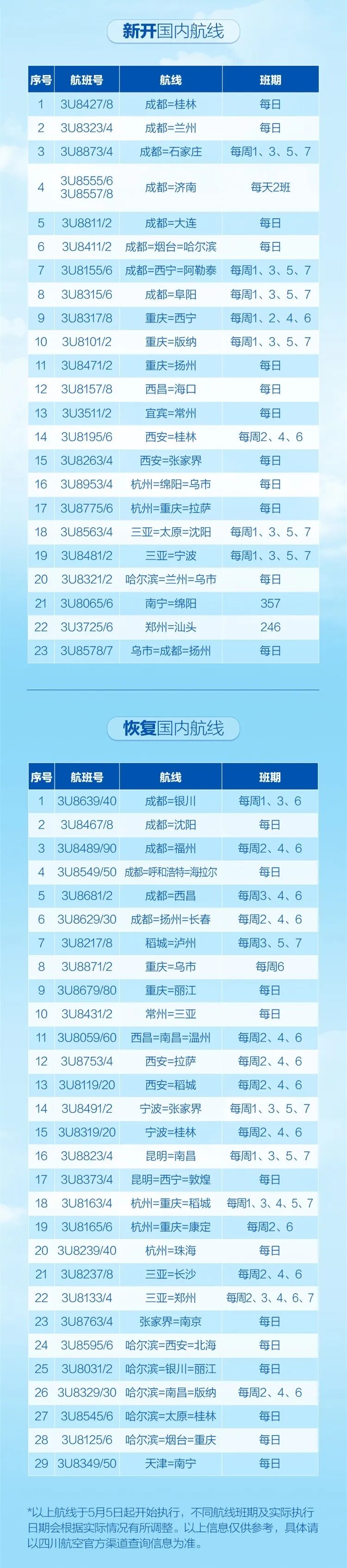 四川航空:2020夏秋航季,四川航空计划恢复新开、恢复50余条航线,具体如下: