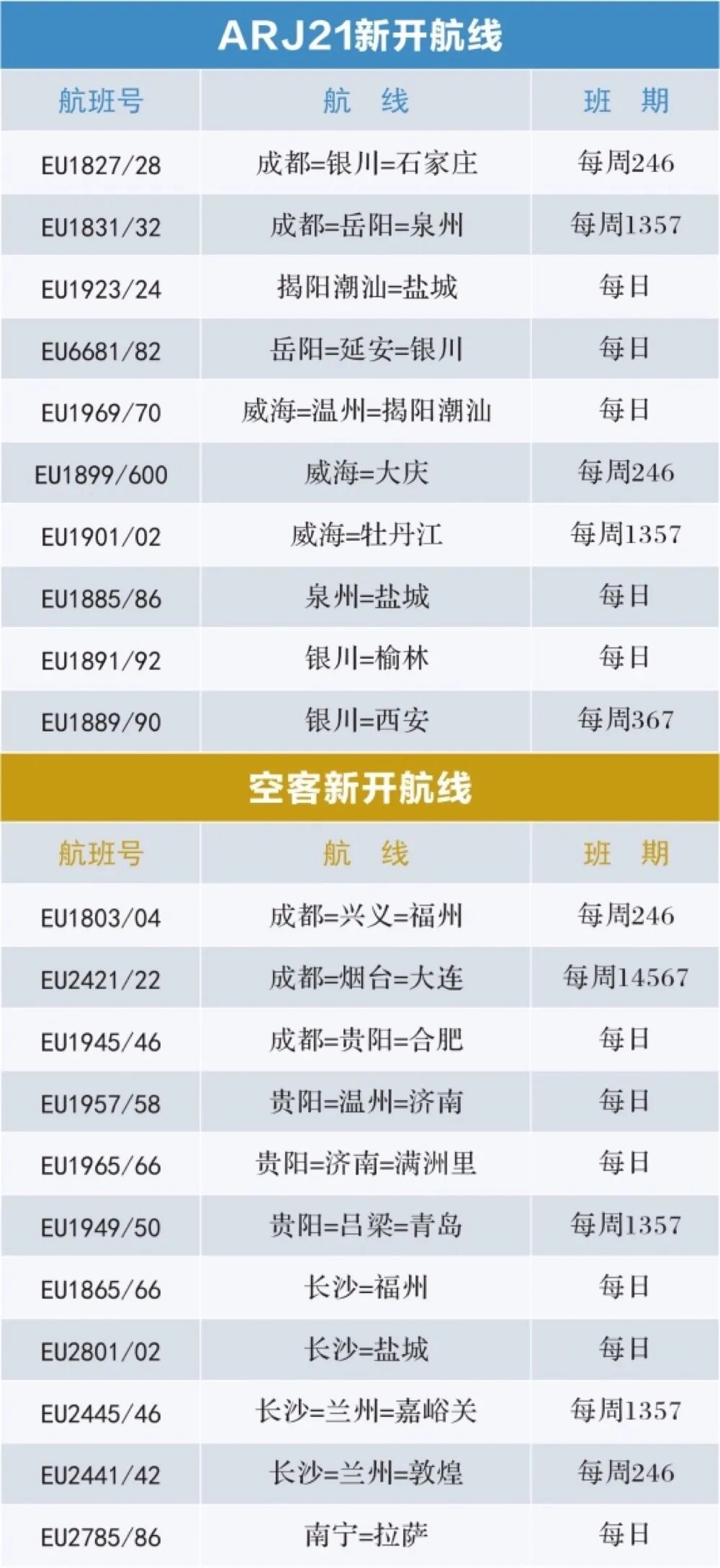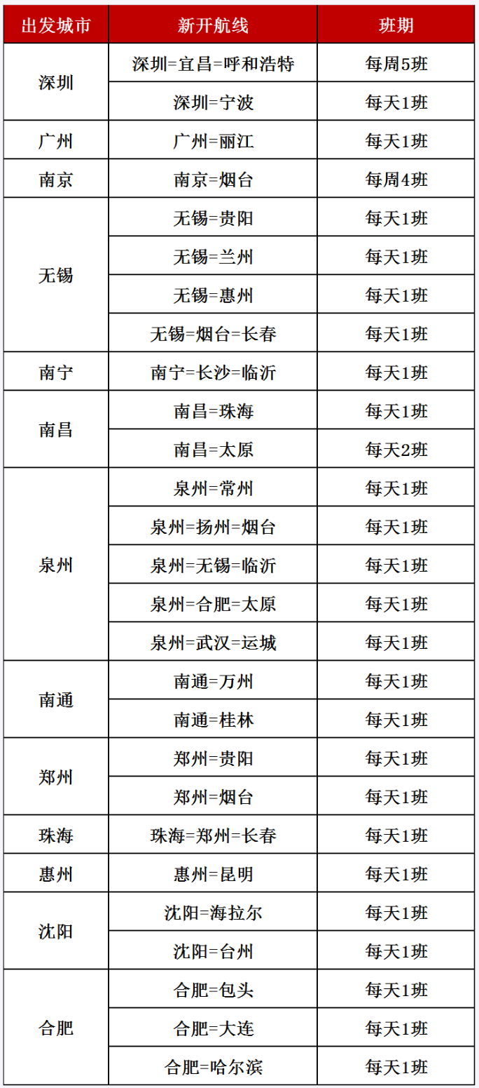 新开杭州=盐城=西宁、杭州=铜仁=昆明、杭州=临沂=银川、杭州=铜仁=丽江、杭州=延安=兰州、杭州=遵义=西双版纳、杭州=泉州=三亚、杭州=邯郸=西宁、杭州=鄂尔多斯、宁波=毕节=丽江、宁波=襄阳=丽江、宁波=南阳=西宁、温州=深圳、温州=徐州=西宁、温州=十堰=丽江、温州=桂林=西双版纳、温州=武汉、温州=遵义=丽江、温州=临沂=西宁、西安=成都、西安=沈阳、西安=长沙、西安=银川等航线。(来源:民航资源网)