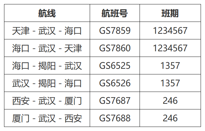 天津航空:4月8日起,天津航空武汉航线,逐步恢复,具体如下。(来源:天津航空官方微信)