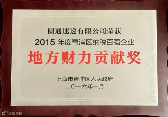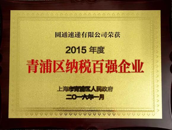 圆通速递荣获上海市青浦区政府颁发“2015年度青浦区纳税百强企业--地方财力贡献奖”奖牌。