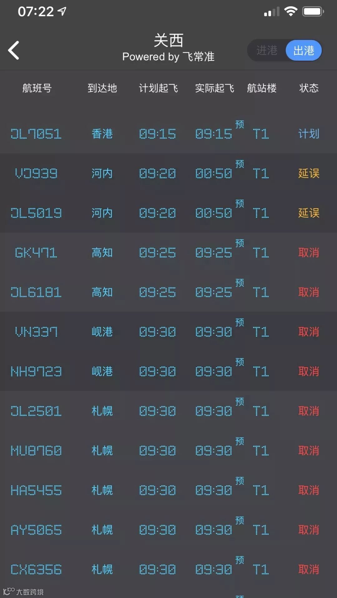 今早的日本关西机场,除一两架日航航班,其他航班几乎也全部取消