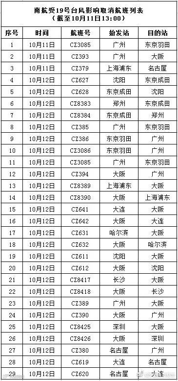 昨天下午中国南方航空发布消息:受19号台风影响,南航取消10月11日、12日在东京、大阪、名古屋机场进出港的29个航班。
