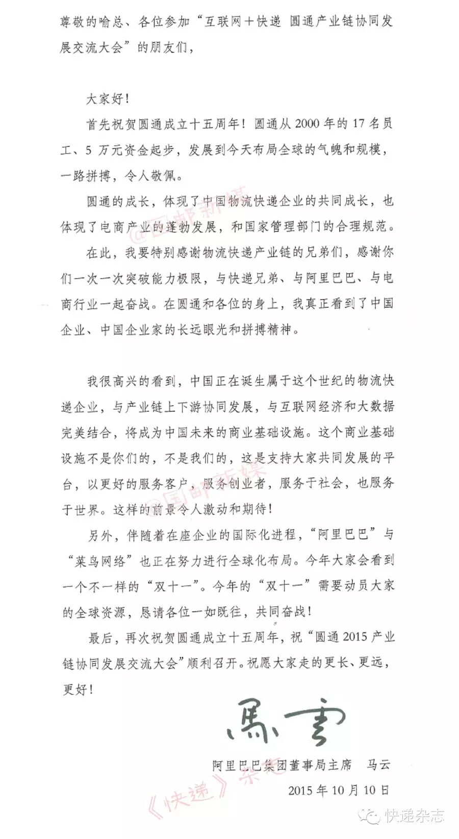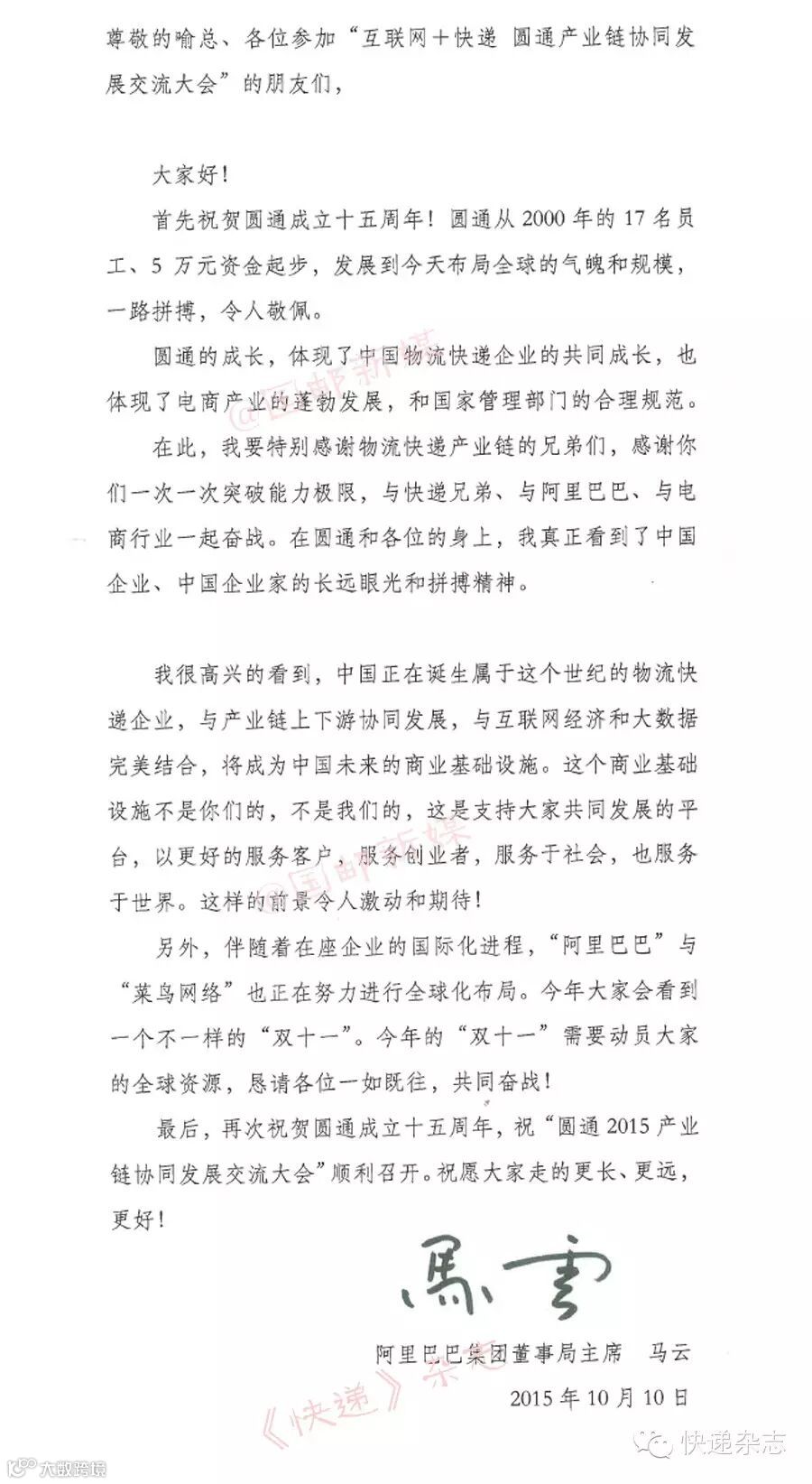 圆通速递董事长喻渭蛟在论坛上作了激情演讲。喻渭蛟认为,我国经济发展“新常态”已经出现“快递点燃消费激情”。快递业对于经济发展的基础性作用日益明显。在国家政府的大力支持下,未来的快递业充满了挑战,更充满了机遇。他指出,电子商务及互联网发展得越好,显示出快递业发展得越好。快递与电子商务的协同发展,必将孵化出更多的产业。随着快递企业服务能力的提升,快递业服务于金融、制造业、冷链、医药等方面必将发挥更大的产业链集成效应。
