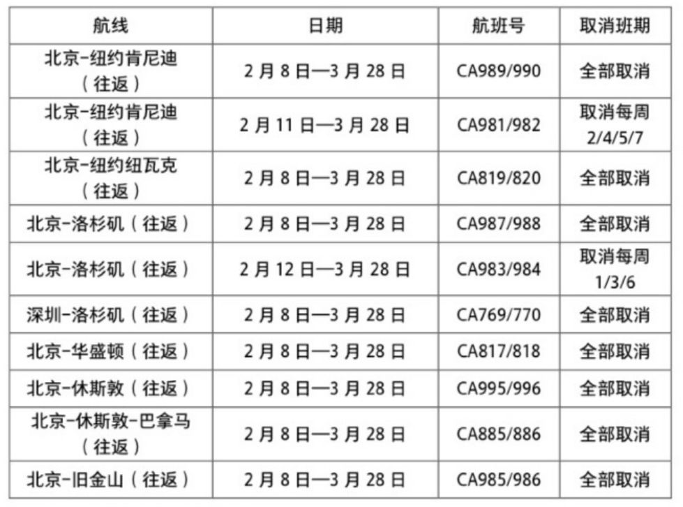 2月11日至3月28日,原北京往返洛杉矶的CA983/4航班,调整为北京-洛杉矶-旧金山-洛杉矶-北京,班期为每周二、四、五、日;原北京往返纽约的CA981/2航班,调整为北京-纽约JFK-华盛顿-纽约JFK-北京,班期为每周一、三、六。