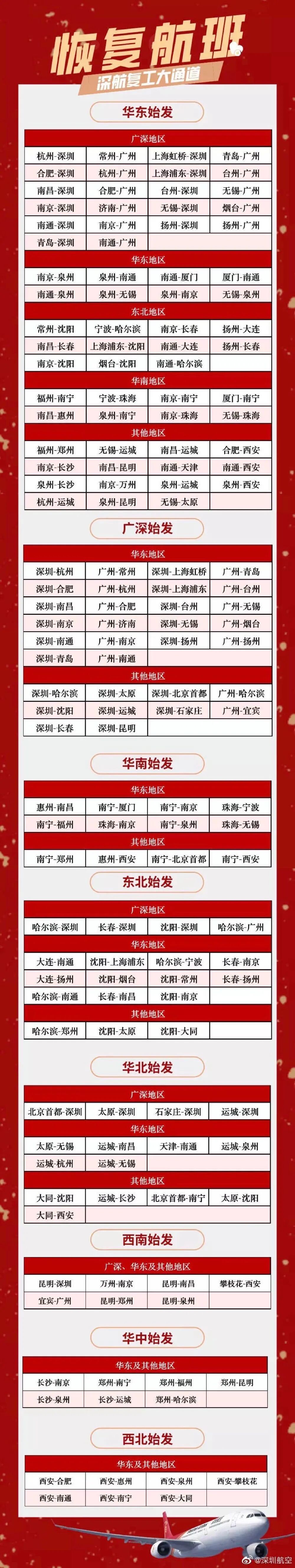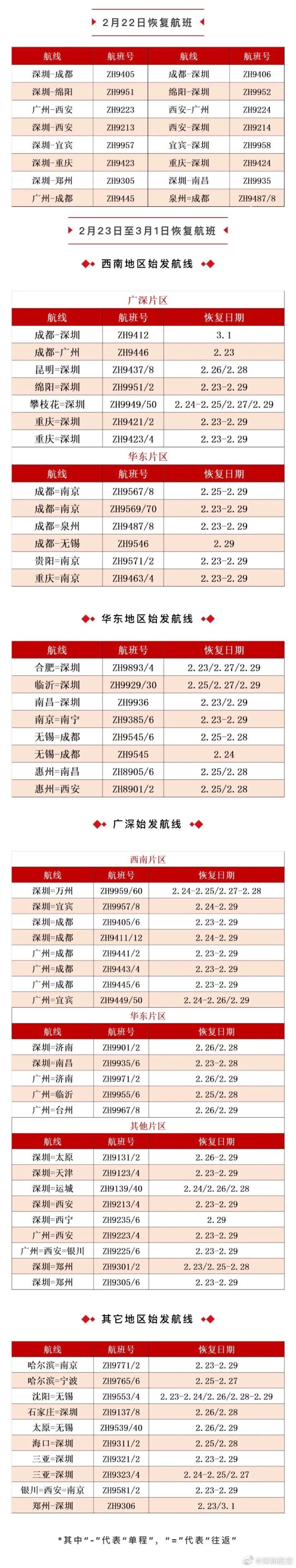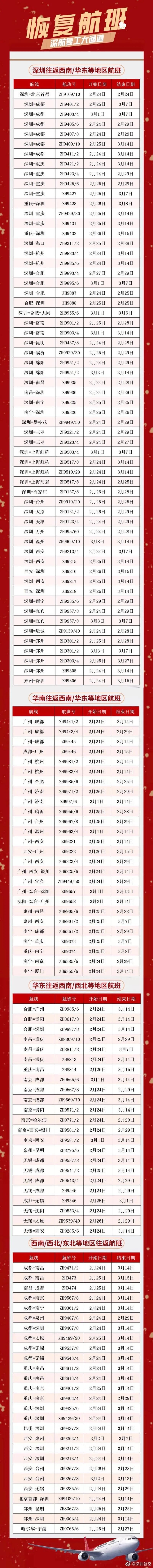 深圳航空:2月22日至3月1日,深航将恢复深圳往返西安、郑州、成都、重庆、绵阳、宜宾、南昌等,广深至西南,西南至广深、华东等方向的近600个航班。