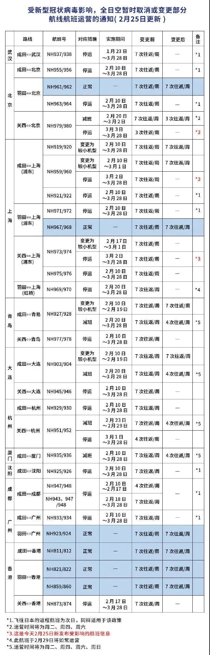 全日空航空:全日空决定全面延长受影响航班的退票时间,2020年4月20日前搭乘的机票可在有效期内免费退款。此外,全日空25日宣布,3月2日-3月28日停飞关西=上海浦东(NH973/974)、3月3日-3月28日停飞关西=北京(NH979/980),由此连接关西和中国大陆的航班将全部停运。截止2月25日取消或变更航班如下: