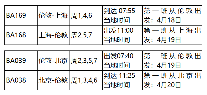 英国航空:往返于伦敦希思罗与北京、上海之间的航班取消时限将延长至4月17日(含)。4月19日-5月31日往返北京的航班恢复为每周4班,4月18日-5月31日往返上海的航班恢复为每周3班。伦敦-香港-伦敦 航线, 取消BA031/032至5月31日,BA027/028正常运行。