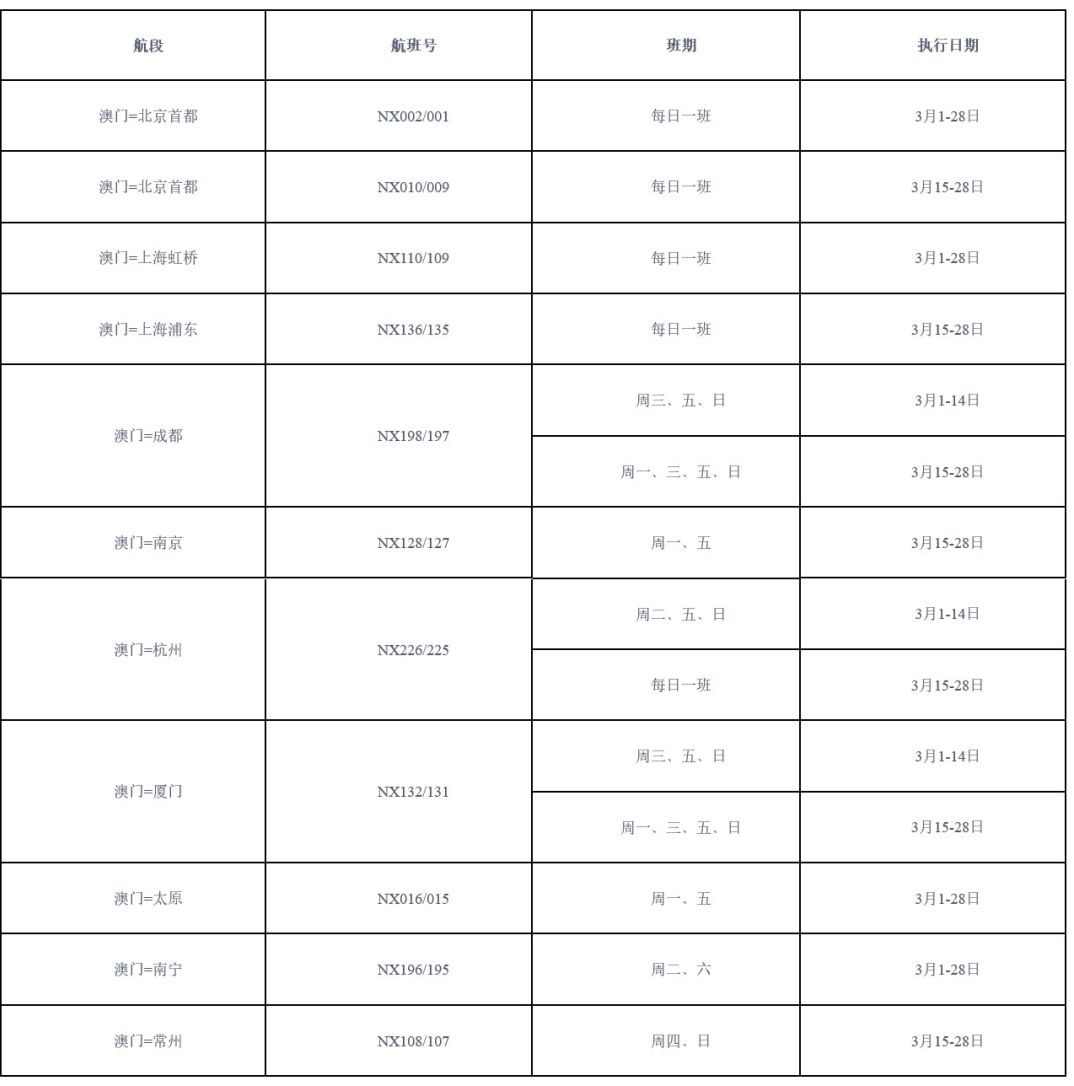 澳门航空:澳门航空将在三月逐步恢复杭州、南京、常州、南宁和太原航班,并加密北京、上海、厦门和成都航班。
