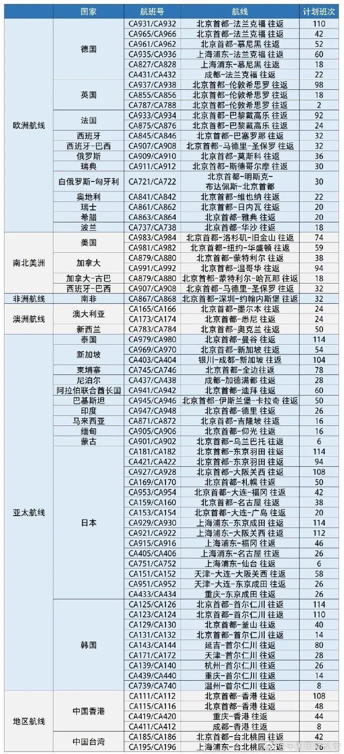 国航宣布2、3月计划恢复国际及地区航线航班,详情如下表(航班信息仅供参考,请以实际执行为准):