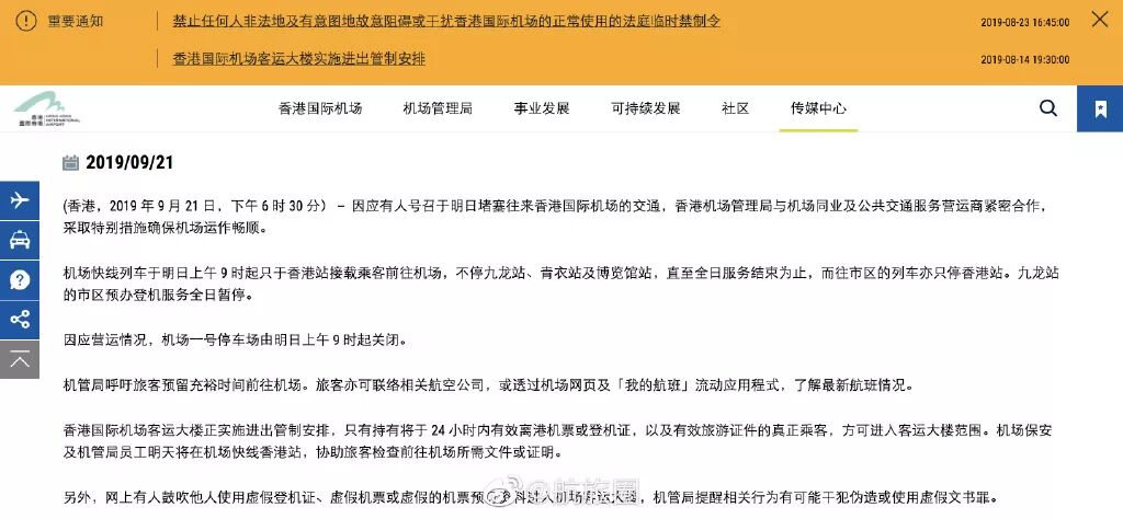 香港机管局9月21日晚发布通告称,因应有人号召于今日堵塞往来香港国际机场的交通,机场管理局己启动机场紧急应变中心,与机场同业及公共交通服务营运商紧密合作,采取特别措施确保机场运作畅顺,保障旅客行程不受阻。