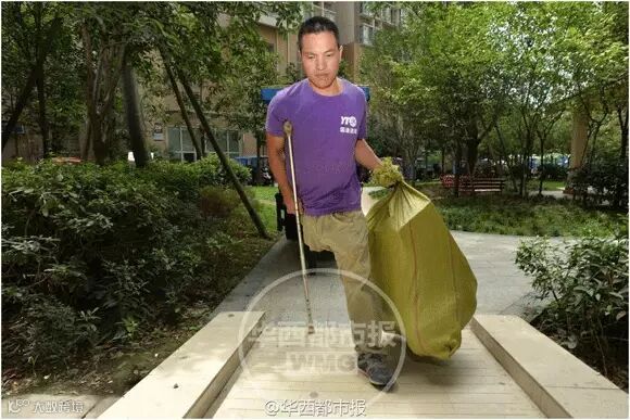 一个背影,感动一座城。这是一个独腿站立的特殊背影,主人公一手拄拐杖一手拿包裹,后背已汗湿,右边胯部以下高位截肢。