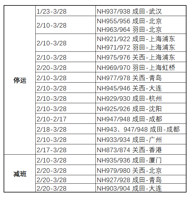 全日空航空:2月13日全日空宣布将进一步暂时减少或取消往返部分城市的航班,具体新增停航和减班航班如下表标红部分。