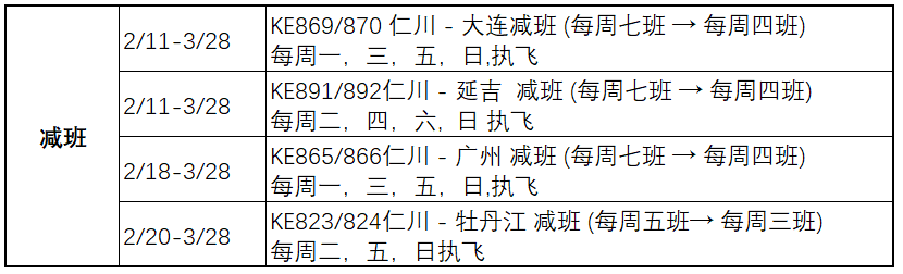 停飞:从2月2日-3月28日,由仁川、釜山、济州出发往返武汉、黄山、张家界、长沙、昆明、青岛、南京、北京、上海浦东、深圳、沈阳、合肥、杭州,厦门,济南,天津,威海,西安,郑州的航班都有不同程度的取消。以下航线减班。