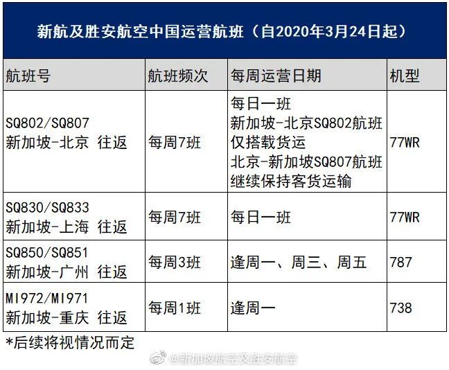 待相关审批通过后,自2020年3月24日起,新加坡航空及胜安航空中国客运航班运营情况如图二所示。(来源:新加坡航空及胜安航空官方微博)