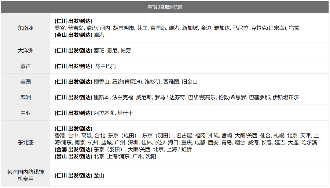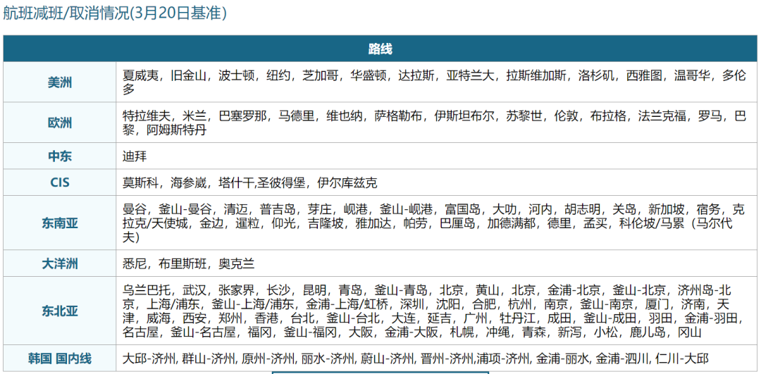 大韩航空:大韩航空3月20日在官方网站更新,受新型冠状病毒疫情影响,大韩航空航班减班、取消情况如下:(根据疫情发展,可能会追加取消航班或减班)
