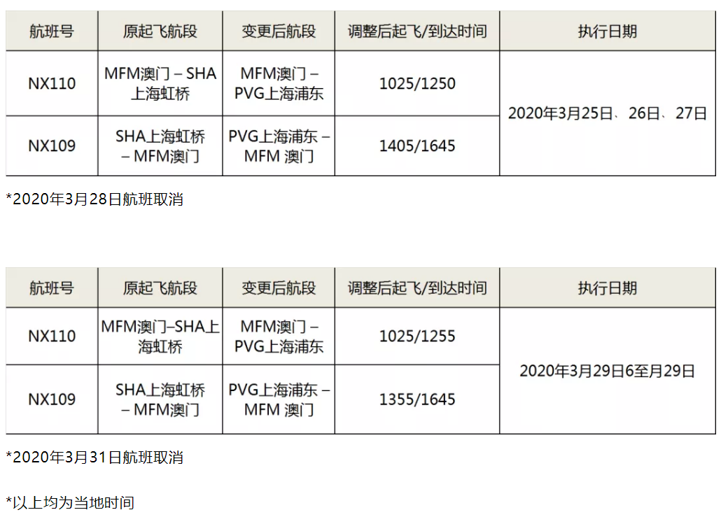 澳门航空:随着新型冠状病毒疫情在全世界范围内的蔓延,为配合做好疫情的输入防控工作,自2020年3月25日零时起,澳门航空原上海虹桥机场起降航班将暂时转场至上海浦东国际机场运营,详情如下: