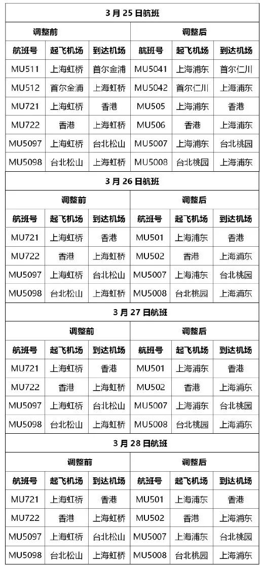 中华航空/华信航空:为配合上海防疫措施,自3月26日起,中华航空CI201/CI202虹桥航班改起降浦东机场,时间维持不变。