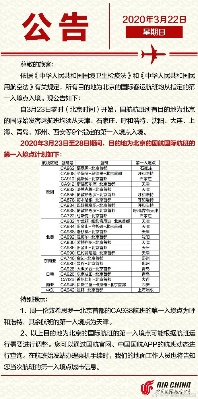 中国国际航空:国航官方微博发布3月23日至28日目的地为北京的国际航班第一入境点计划的公告: