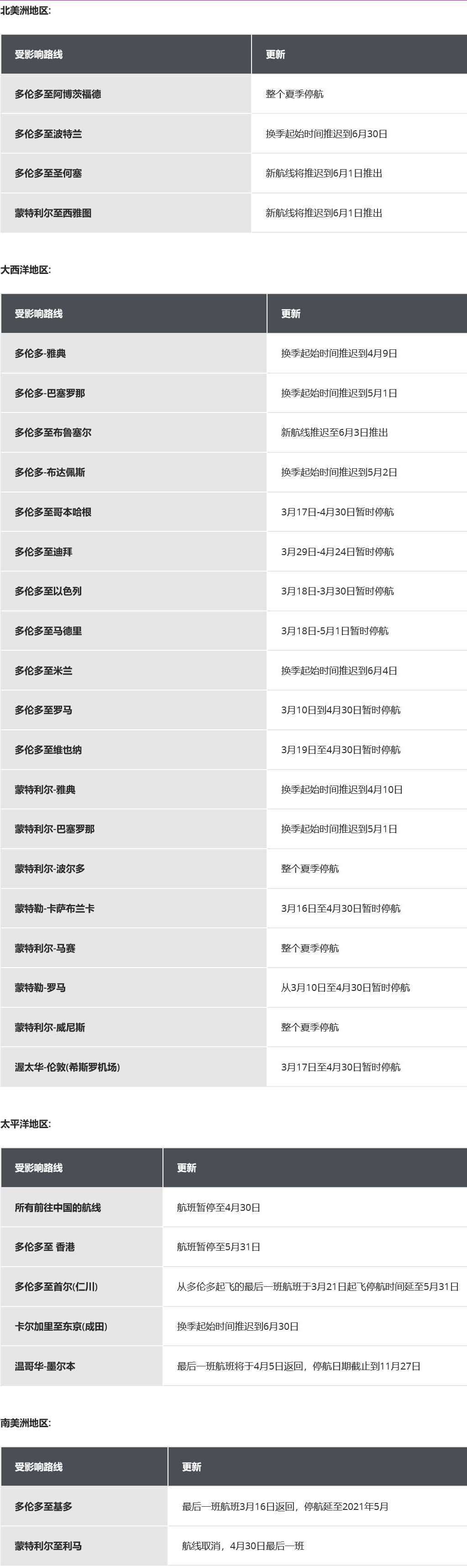 加拿大航空官网3月19日更新了停飞航线的完整名单,具体如下。(来源:加拿大航空官网)