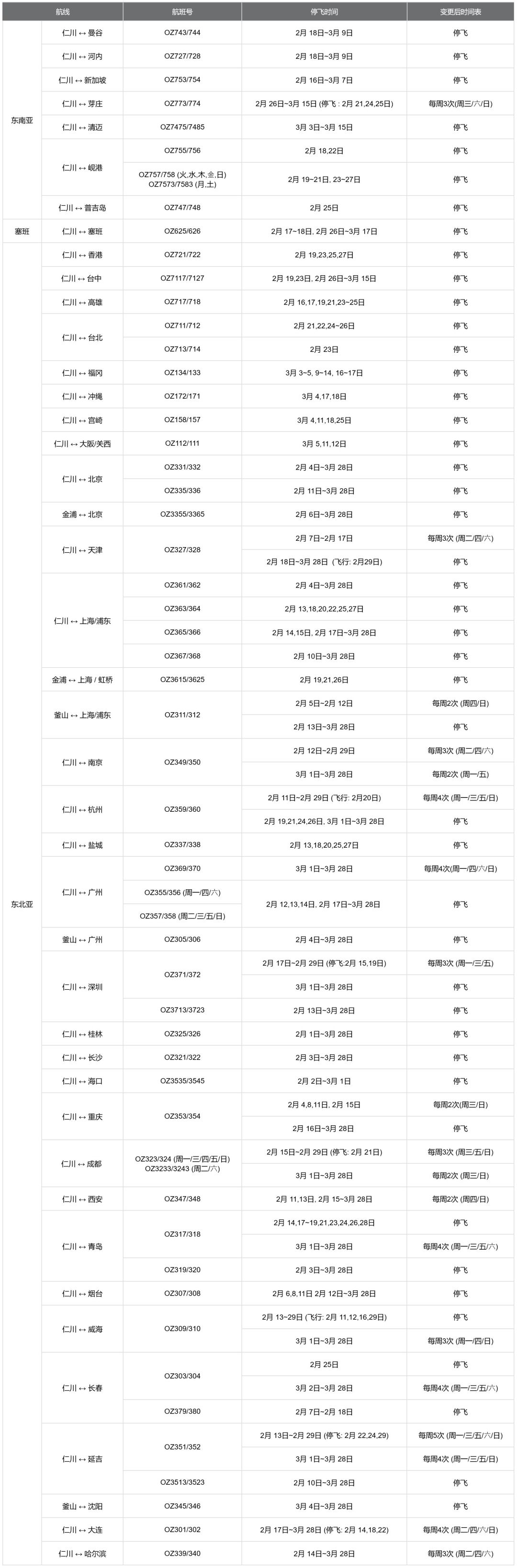 韩亚航空:对中国及亚洲部分地区航班取消及停飞,如下表,各航线具体航班信息可在官网-航班查询-页面查询。