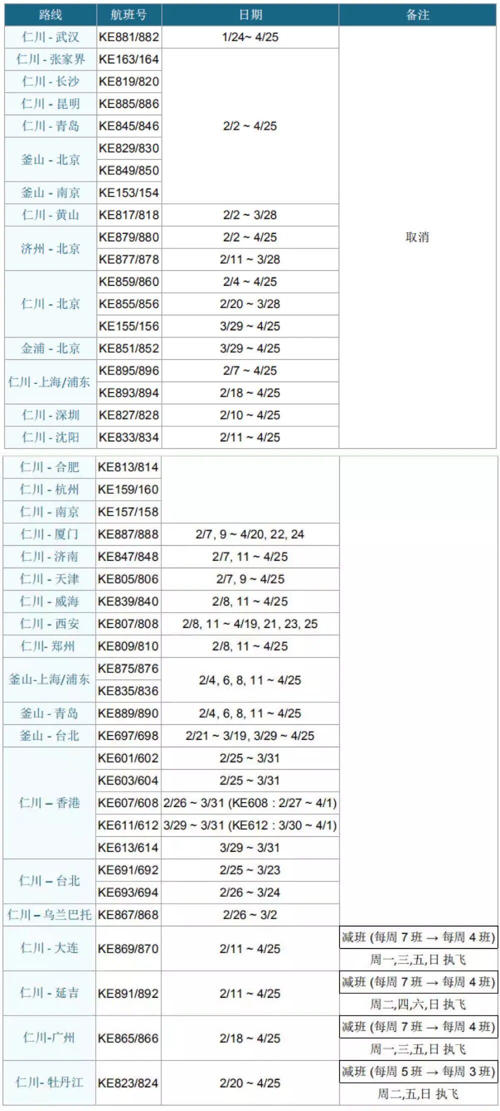 大韩航空决定减少及取消中国地区部分航线航班,因随疫情发展状况,航班时刻可能会有调整,建议旅客前往机场前查询航班最新动态,以下为详情: