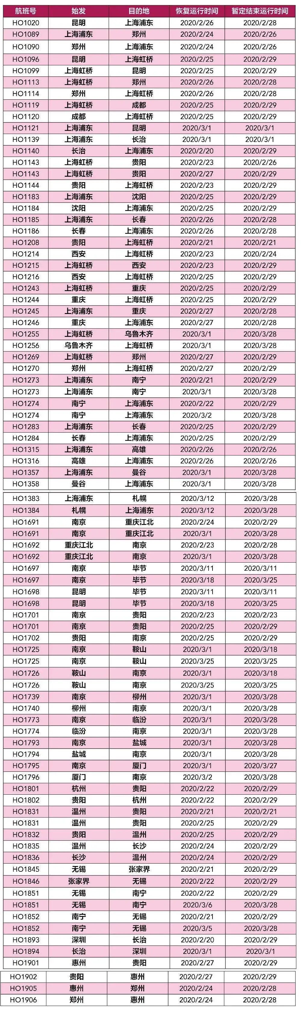 9C8523/4 虹桥=恩施,取消班期:周246,取消日期:3月3日-3月28日