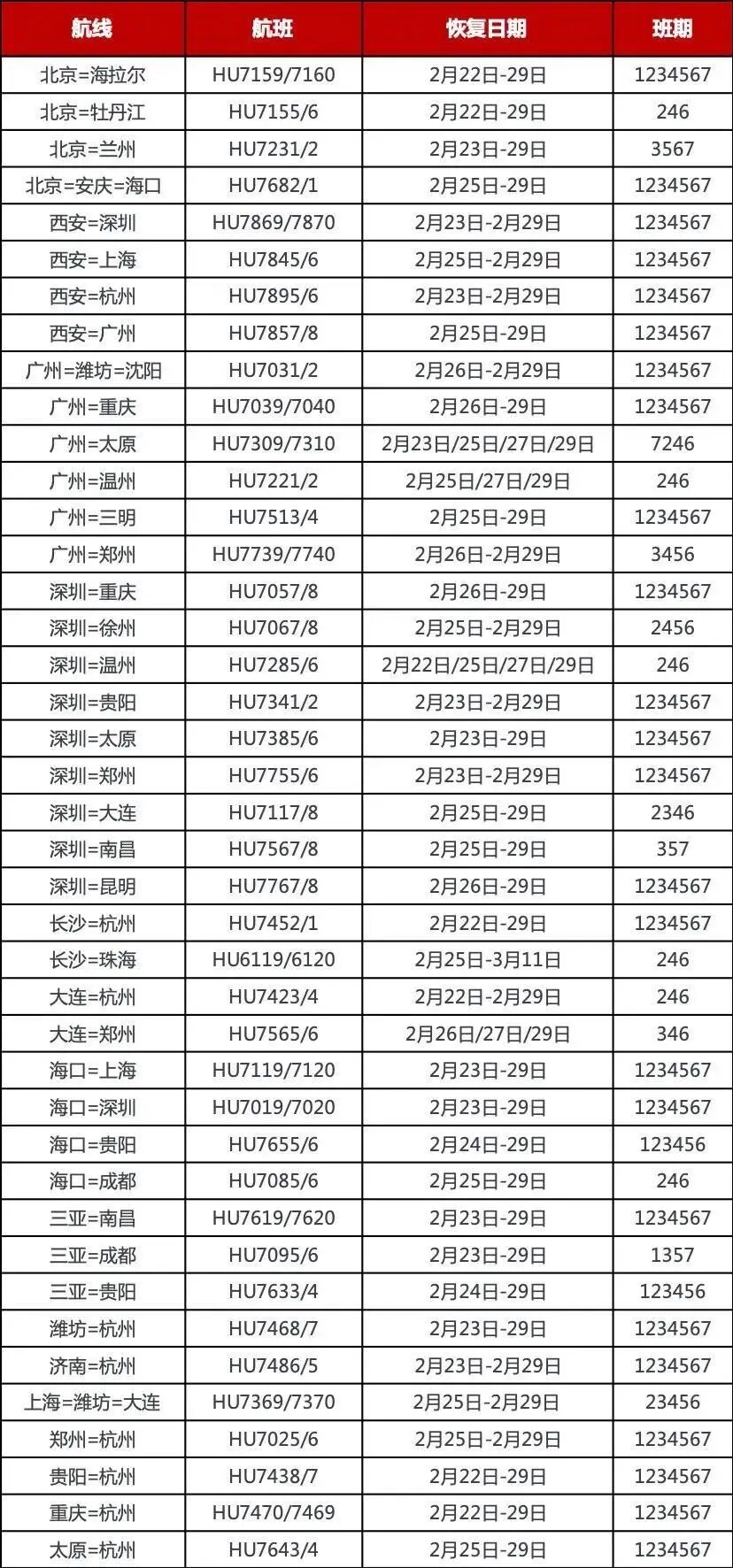 海南航空:2月22日-29日期间,海南航空将陆续恢复从北京、上海、广州、深圳、杭州、海口、成都、重庆、贵阳、昆明、大连、三亚、郑州、长沙、济南等地始发的450余个航班。