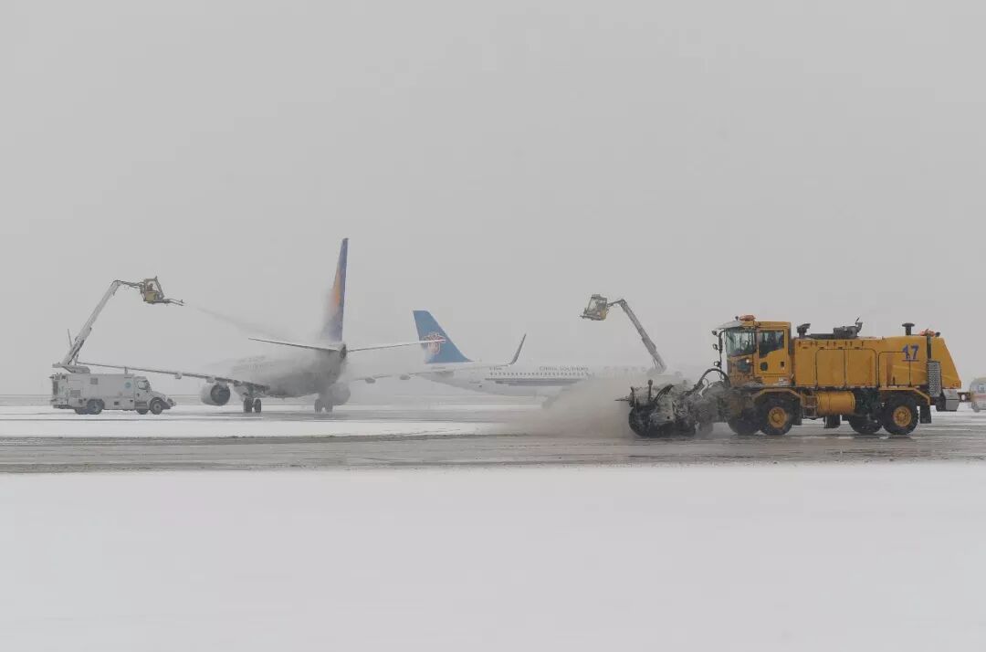 为保证飞机的安全起降,机场工作人员将给飞机进行除冰处理。根据机型、除冰液种类和航司要求等多种因素,每架飞机将花费5-20分钟不等的时间进行除冰。由于首都机场起降航班密集,除冰将会导致部分航班的延误或取消。