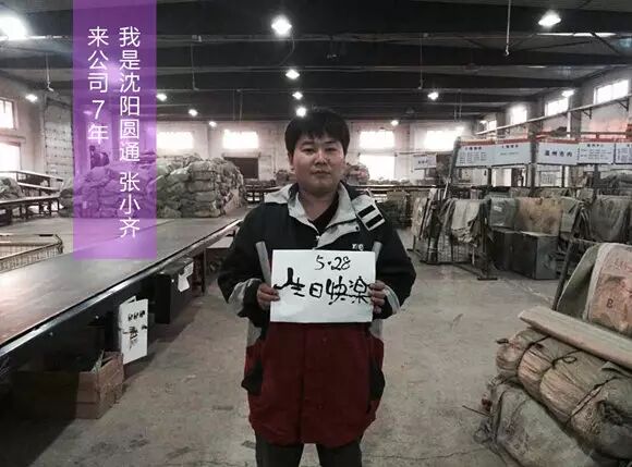我08年进入沈阳圆通工作的,当时并没有什么伟大的理想,只是本着随便找个工作的态度来的,但是圆通却给了我一个大大的惊喜,到今年我已经在圆通工作7个年头了,沈阳圆通发生了巨大变化,操作中心多次搬迁,越做越大,公司的待遇、工作效率,也大幅度提升,现在我已经喜欢并爱上了这个圆通大家庭。圆通成了十五年之际,我祝愿我们的圆通越走越远,并在新的征途中再谱新篇!
