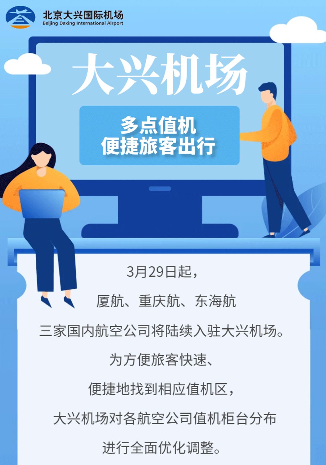 厦航MF、重庆航OQ、东海航DZ在3月29日全部转场至大兴机场运营。