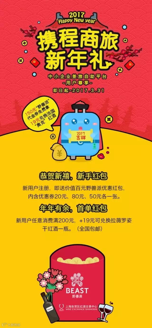 新手红包:新用户成功注册携程商旅企业自助平台,即获赠野兽派代金券,代金券有效期为发券日至2017年6月30日,使用详情参照代金券规则;