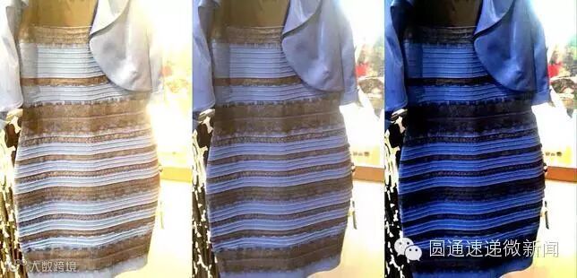 呃,结果表明——有些人认为是蓝黑色的,而有些人觉得是白金色的。撇开网络爆红的现象来看,你的看法无法告知你自己是否压抑,躁狂,疯狂,或者其他情绪。但是人们的确有着不同的观点。这仅仅是与我们的眼睛对光线的处理和我们的大脑对视觉信息的处理方式有关。令人意想不到的是,我们并非人人都是一样的——尤其是当我们我们处理的光波是在两种不同的颜色的分界线上时。使影像变得明亮,那么它就会看起来明显偏白色和偏金色。使影像变得暗淡,那么它就会看起来明显偏蓝色和偏黑色。