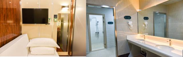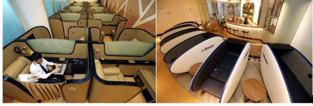 萧山机场从芬兰引进的豆荚,配羽丝绒被子和枕头,USB接口。还有提供五星级宾馆级床品的商务舱,非常类似飞机头等舱,座椅可调节至平躺。另外还有有单独的淋浴间、卫生间。提供手工咖啡、简餐价格很良心,矿泉水只要2元,并且有叫醒服务,还可以免费换登机牌,托运行李!