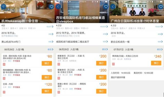 这3个机场休息室在携程商旅可直接预订,差标丰厚的差旅侠可以体验一下,看评价各有利弊,杭州机场更舒适价格低,但是因为是半开放式隔音效果略差。西安机场相对隔音好,但是空间密闭。广州机场评价都不错。其实各大机场大部分都提供了计时休息室,差旅侠们可以使用携程商旅,搜索机场休息进行检索。