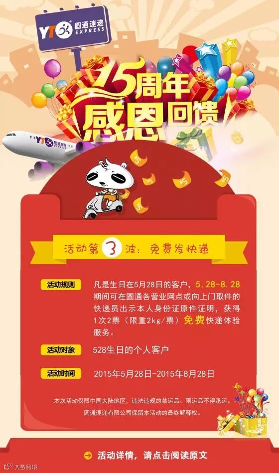 从2015年5月28日至8月28日,凡是生日在5月28日的客户,可凭身份证原件在圆通各营业网点或向上门取件的快递员出示身份证原件证明,获得一次2票(限重2kg/票)免费快递寄递服务。活动期间寄递范围仅限国内大陆地区,违法违规的禁运品、限运品不得承运。