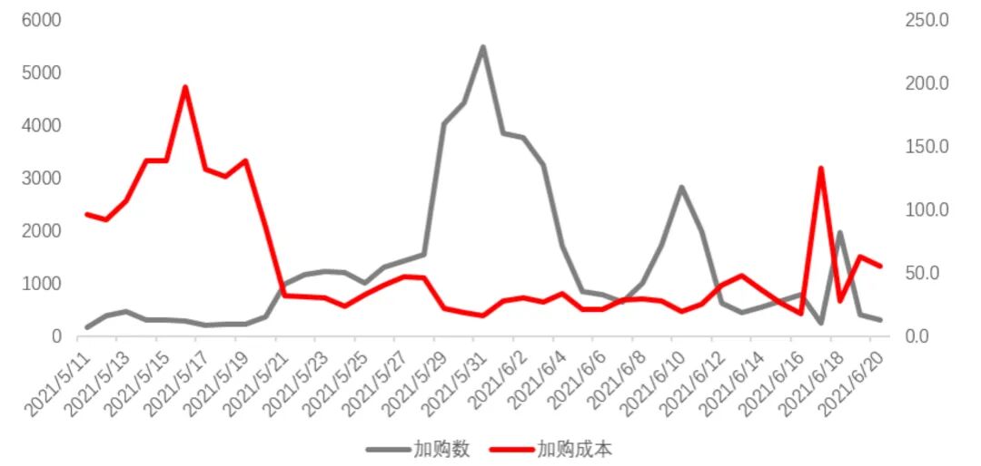 (1)在11-20日初步投放阶段,主要覆盖类目潜在人群,为618大促提前布局,前期随消耗提升,加购成本上升明显,之后通过投放点位、出价优化,成本有所下降;