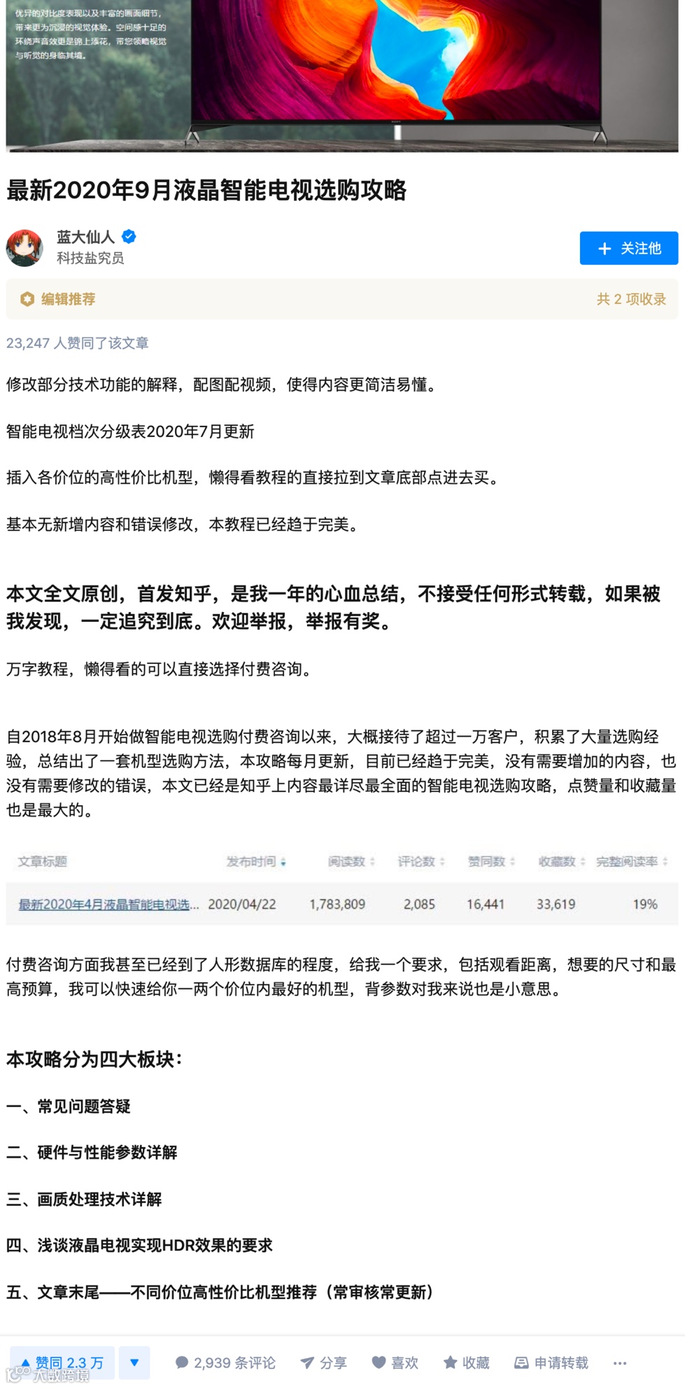 一个效果明显的案例是“蓝大仙人”。他是活跃在知乎电子消费话题的一名用户,对于电视有非常深入的研究和经验。得益于他自身长期积累的专业信任度,并借助知乎平台的「好物推荐」,他创作的电视种草评测文章《最新2020年9月液晶智能电视选购攻略》自2019年底上线以来,持续每月更新,已经带来了超过4000万的GMV 转化。知乎内容长尾效应的持续增长动能可见一斑。