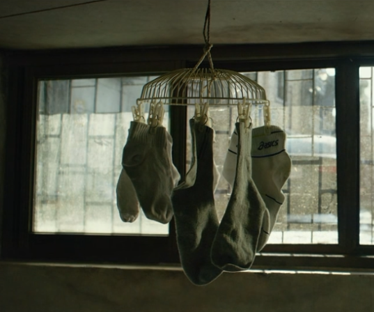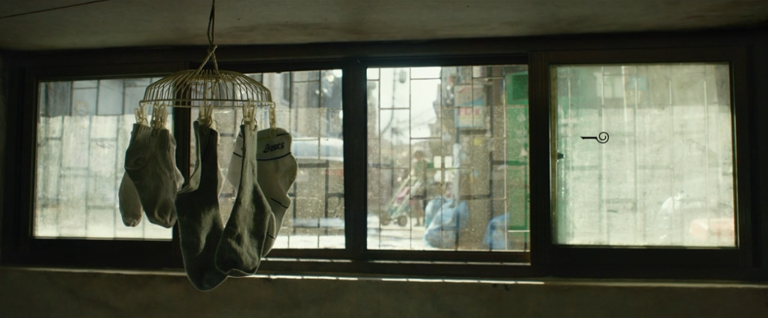 画面中,袜子挂在简陋的布满铁锈的衣架上,放置在窗口。导演十分注重画面构图,这个画面中心主体就是袜子,画面中,洒进房间的阳光也只有一点点,室内的昏暗和室外的明亮形成强烈对比,这其实也是在视觉上揭示了主人公穷人阶层的生活状态。
