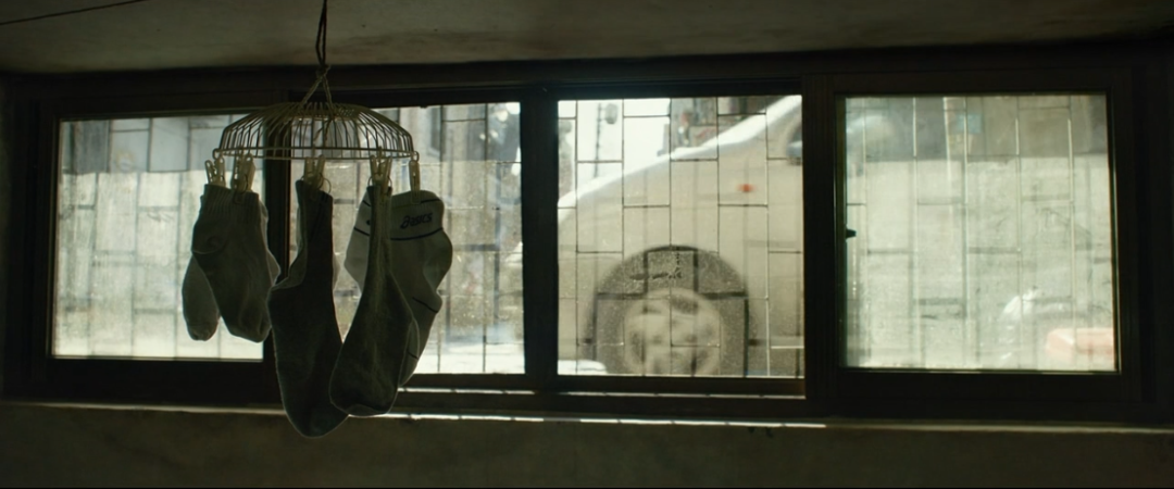 接着向下看,导演证明这一家人住在地下室时,用了一个长镜头来体现,用最简洁的语言传达最多的信息量。比如,我们眼睛望到窗口,会看到一个车轮开过去,仅仅通过这么一辆经过的车,就能让观众很直观地明白——这家人住在地下室。