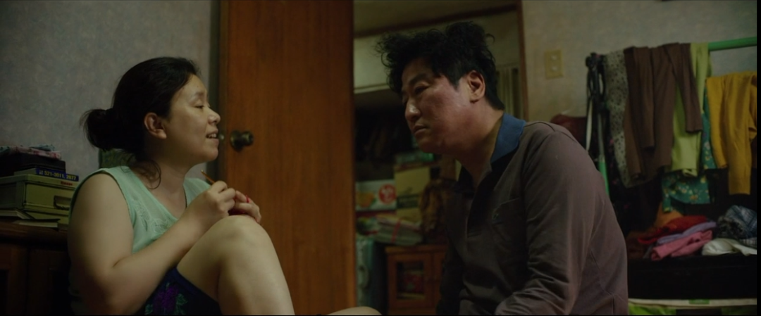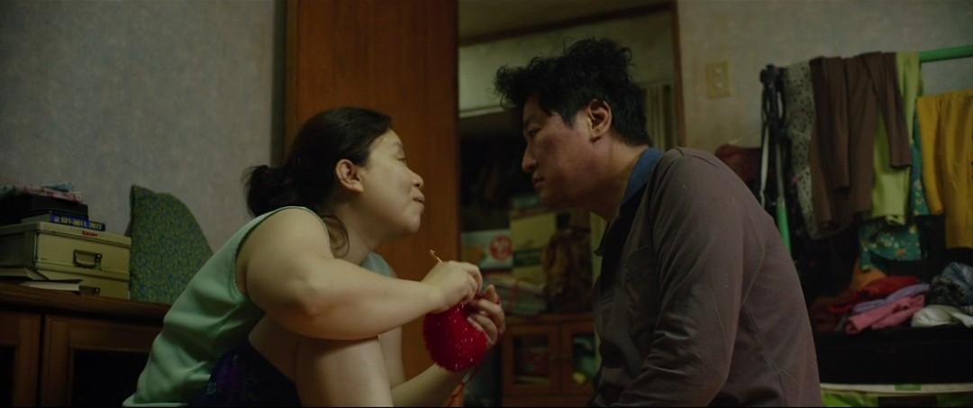 为什么导演要在这里运用焦点转移技术?看过电影的同学都知道,以后这个家人是要慢慢走出房间,往富人阶层生活的。所以导演运用焦点转移,形成从屋内到屋外的过渡,暗合电影之后要表达的主人公的情绪和生活状态。