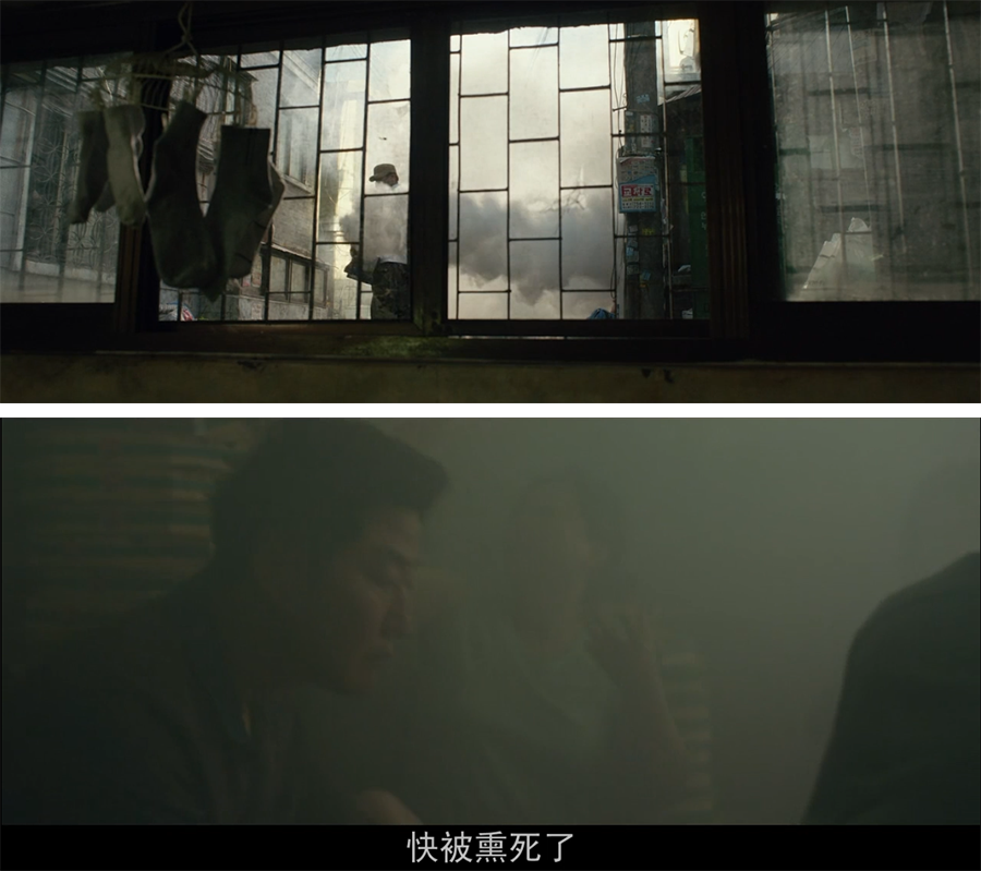 回到上一个镜头,我们看到刚开始还是阳光明媚,现在阳光没有了,被消毒喷雾覆盖,可是谁会在在外面放消毒喷雾时故意将窗子打开呢?这家人偏偏就打开了。一家人沉浸在这种烟雾当中,其他人咳嗽得很厉害,只有父亲非常淡定,刚才的阳光也转瞬即逝,这在电影中属于夸张表现,这种强烈的对比也是揭示了一家人社会底层的状态。